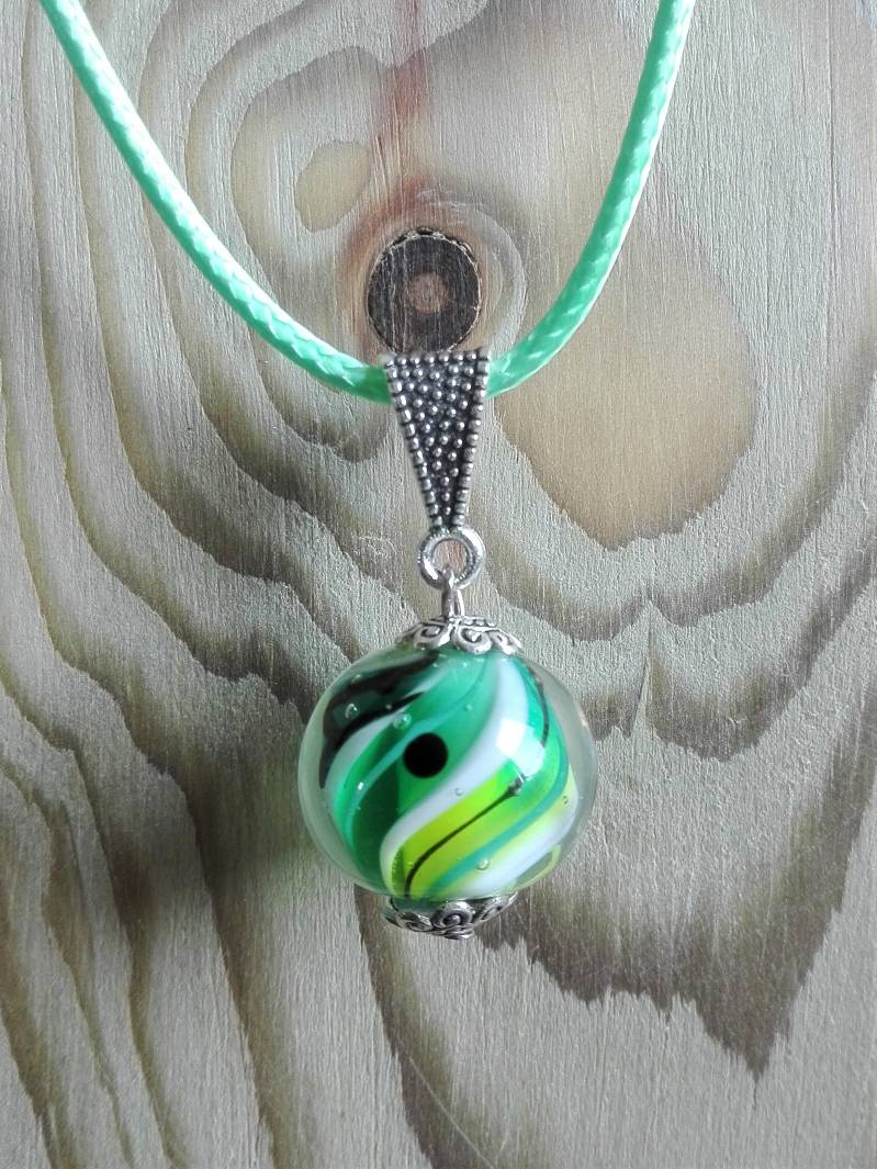 Ketting met in eigen atelier gemaakte glaskraal, lijkt een beetje op de glasknikkers van vroeger. De foto laat twee kanten van dezelfde kraal zien.