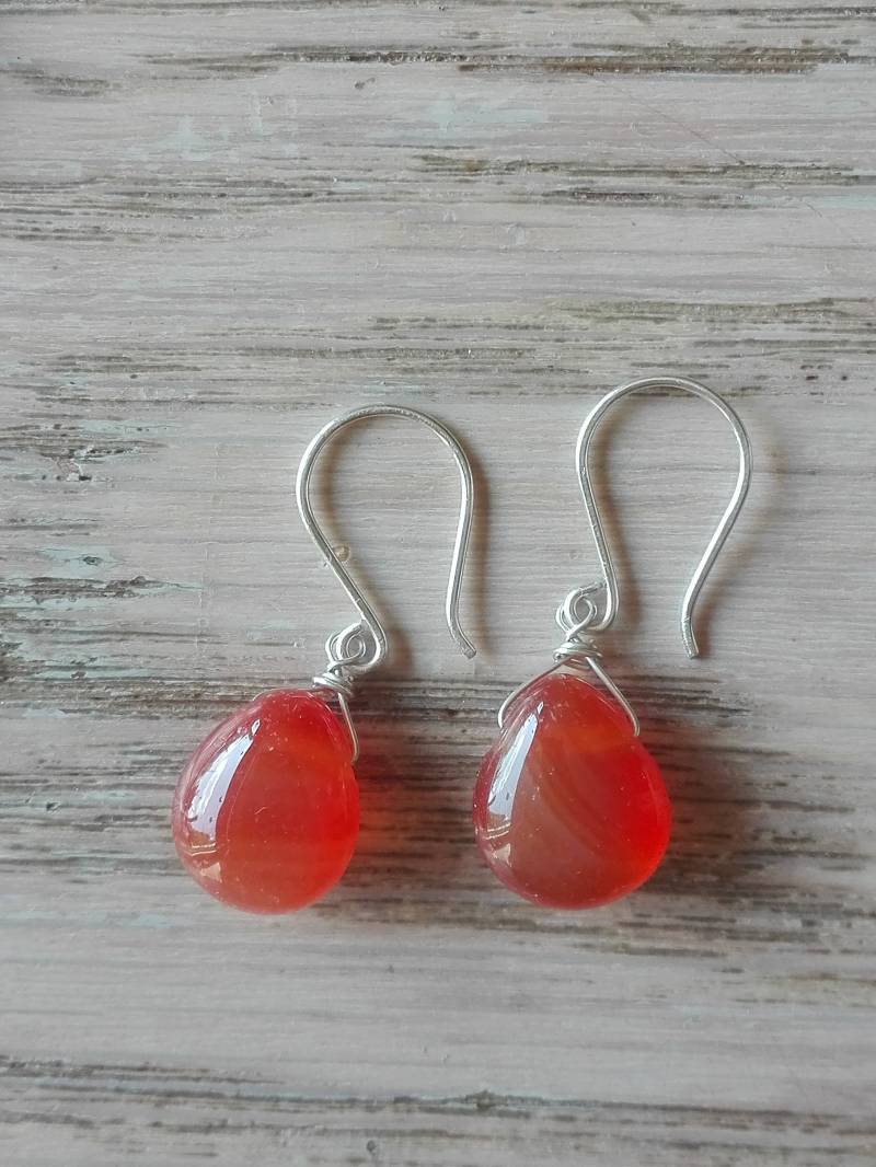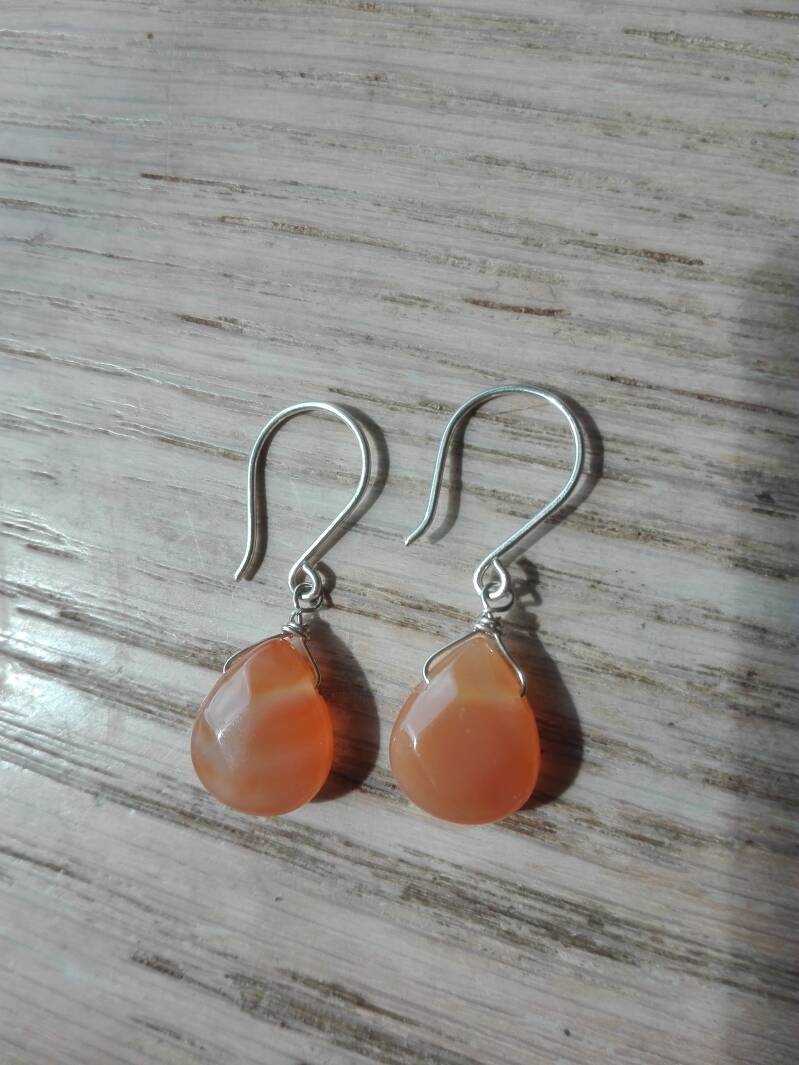 Oorbellen echt zilver en een druppel geslepen carneool (facetten niet goed te zien op de foto) van 12 x 10 mm. groot.